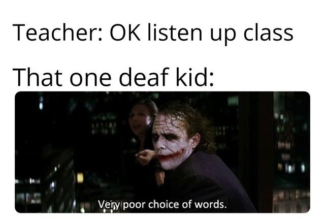 Here are 8 deaf memes that describe the struggle of being deaf or hard of hearing. Smile nod nod smile. Origin on april 14th 2018 redditor 1 vicious viridian posted an image of a man performing a dance move presented as a reaction which deaf people have when music caption appears on screen to r dankmeme subreddit.