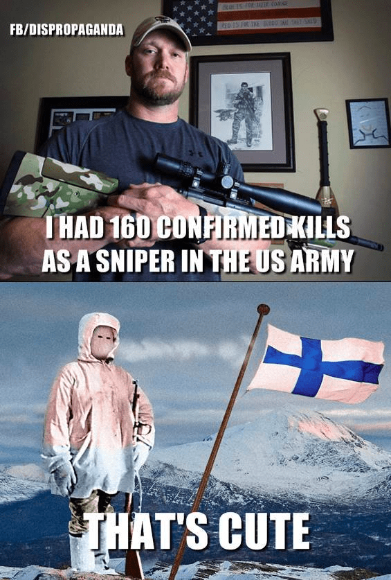 Simo häyhä also known as the white death is widely regarded as the most skilled and successful sniper there ever was with over 500 kills to his name. Know your meme is a website dedicated to documenting internet phenomena. During the winter war fought between russia and finland in 1939 1940 he had 542 confirmed kills with iron sights a record that still stands today.